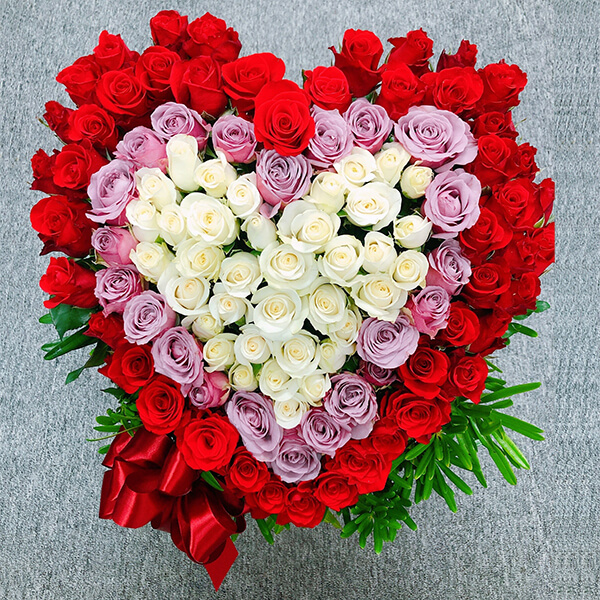 Lẵng hoa được các thợ hoa chuyên nghiệp tạo thành hình trái tim hết sức ấn tượng. Lẵng hoa chứa đầy tình yêu này được tạo nên từ những đoá hồng tươi rói nhiều màu sắc và cực kỳ lãng mạn.